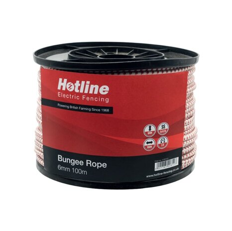 The Hotline 6mm White/Red Supercharge Bungee Rope is a high-quality, six-strand expandable rope designed for creating flexible, secure electric fence gates and access points. Manufactured with durable stainless-steel conductors woven through the rope, it delivers excellent conductivity while allowing smooth extension and retraction for daily use.