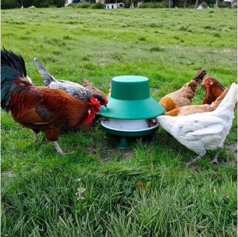 The feeder can be used standing or hung, giving flexibility to suit your poultry setup. Four clip-on feet elevate the feeder, further protecting the feed from dirt and contamination. For outdoor use, an optional rain cover is available to keep feed dry during wet weather. Its smooth plastic construction makes the feeder easy to clean, promoting hygiene and longevity.