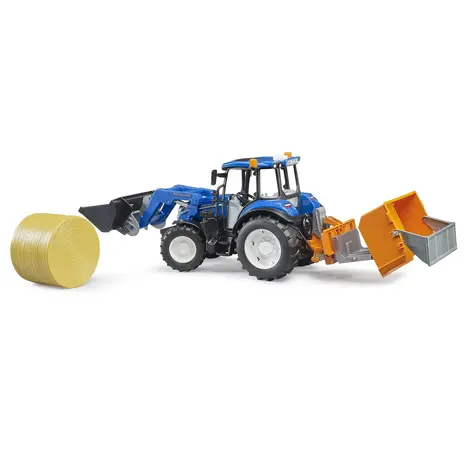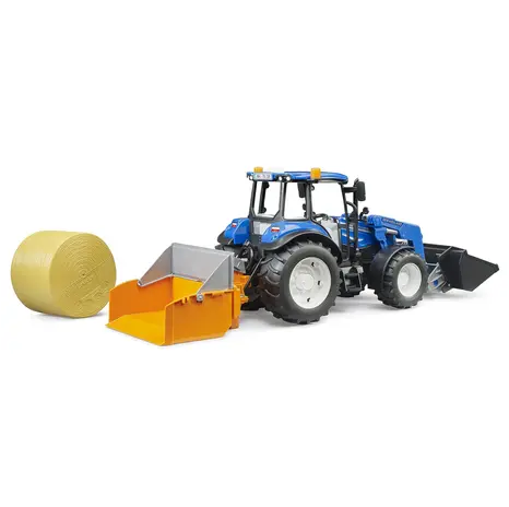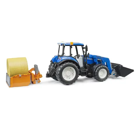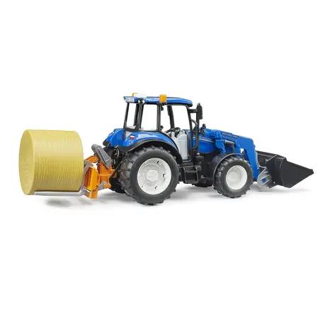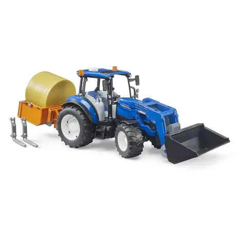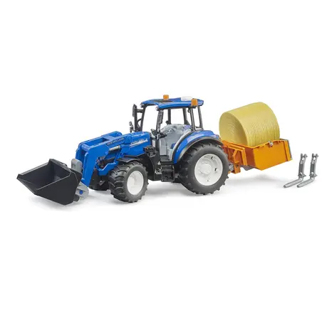 The Bruder New Holland T5.120 with Front Loader, Loading Box, Forks and Round Bale (1:16 scale) is a detailed and robust model tractor designed for imaginative play both indoors and outdoors.