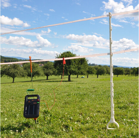 Horse posts are very durable plastic posts from Gallagher with a height of 1.55 m. These plastic posts are particularly suitable for semi-permanent horse fences, but are also suitable for other animals. The practical stirrup foot step allow the posts to be easily and quickly set up in the pasture and pressed/stepped into the ground. The Twist & Lock system allows for easy and stable attachment of the power posts. With this system, pasture fence construction becomes child's play!