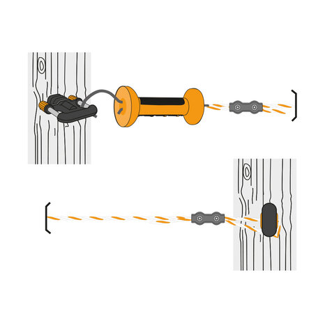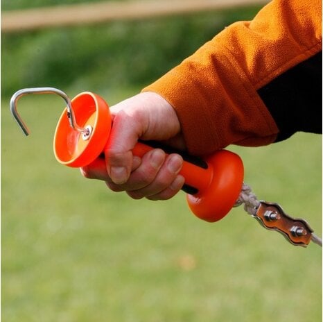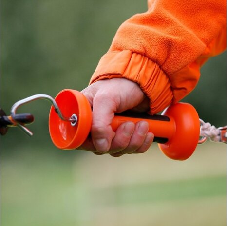With the stretchable electric rope, you can quickly set up an electrified gate that extends from 3 meters to 6 meters, perfect for larger pasture entrances. The sturdy orange gate handles, equipped with a soft-touch grip, allow for easy opening and closing of the gate by simply hooking or unhooking the handle from the insulator.