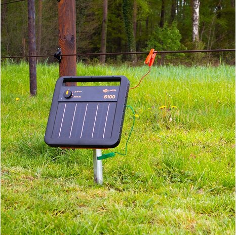 The S100 is the ultimate mobile energiser for short fences up to 30 km (solid wire, without vegetation). The electric energiser is supplied with a rechargeable battery and solar panel. The S100 is quick and easy to install and convenient to transport. This robust and extremely mobile device offers an excellent alternative to battery powered systems. We recommend buying the Gallagher stand(007509) to perfectly position your energiser to the sun. In addition, this energiser can be charged using a battery charger when there is insufficient sunlight or during storage.