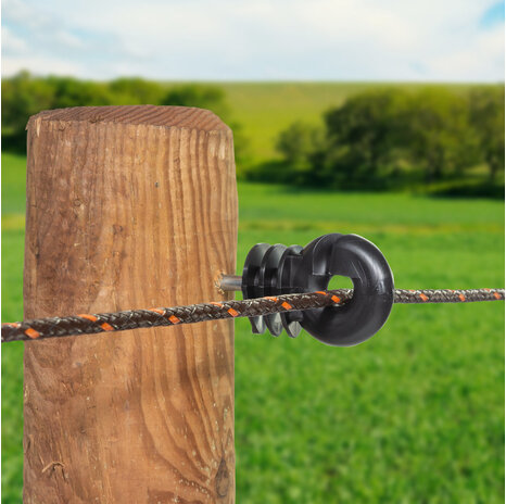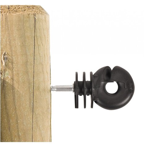 Solid High quality screw-in insulator without metal core, therefore no short is circuiting possible. For adding a wire to a wooden fence post.