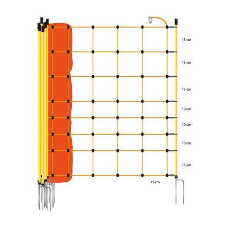 This 90 cm high and 50 metre electric net from Gallagher is equipped with orange stranded wire. Of the 8 horizontally processed plastic strands, 7 are live and fitted with stainless steel conductors. This ensures very good herding safety. The lowest strand is not live in order to avoid voltage losses. A plastic seal at each mesh cross point ensures good sheathing properties and is permanently welded there. Thanks to the orange colour, the net is easily visible for your animals. The 14 yellow plastic stakes with metal double points are each equipped with a head insulator + ground stopper.
