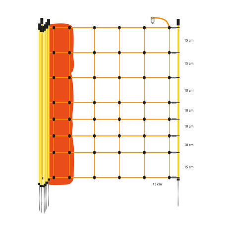 This 90 cm high and 50 metre electric net from Gallagher is equipped with orange stranded wire. Of the 8 horizontally processed plastic strands, 7 are live and fitted with stainless steel conductors. This ensures very good herding safety. The lowest strand is not live in order to avoid voltage losses. A plastic seal at each mesh cross point ensures good sheathing properties and is permanently welded there. Thanks to the orange colour, the net is easily visible for your animals. The 14 yellow plastic stakes with metal single points are each equipped with a head insulator + ground stopper.