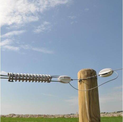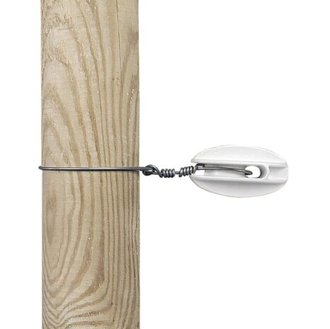 Plastic insulator for fitting cord and wire to wooden posts. Made from polycarbonate for extra strength. Used on the first or last wooden fence post for tensioning wires to keep the fence tight. Comes with a 10-year warranty.