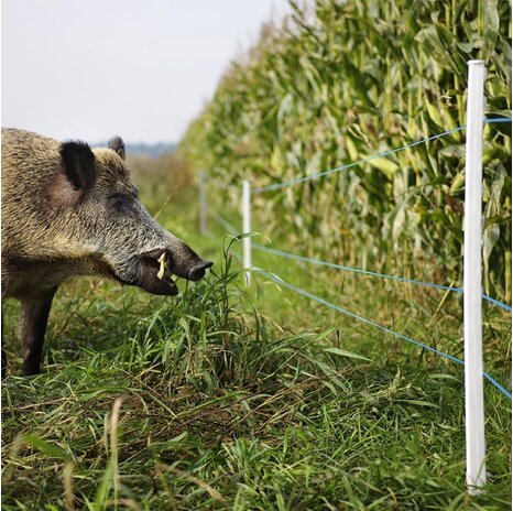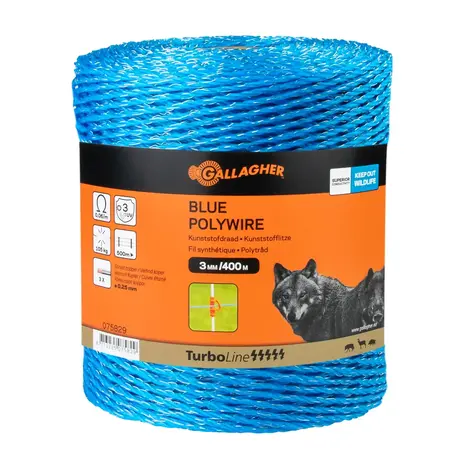 The blue pasture fence strand from Gallagher - TurboLine, proven in practice for years. The 3 tinned copper wires (0.25 mm) and 21 polyethylene wires (0.38 mm) ensure a safe current flow. This blue Gallagher plastic wire has been specially developed to repel game, especially wild boar and wolves. Studies show that wild boar have poor eyesight and perceive predominantly blue.