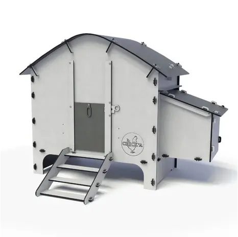 - Includes ramp, 1 manual door, 1 nesting box, 2 perches, maintenance flap