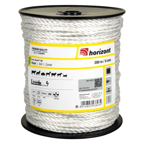 The Horizont Electric Fence Rope Farmer® R6 is part of the Farmer® all-rounder series, designed for efficient pasture management and safe containment of calm grazing animals under normal operating conditions. Its white colour provides excellent contrast against natural surroundings, improving visibility at dusk and in low light, making it ideal for short fences and portion pastures with sparse vegetation.
