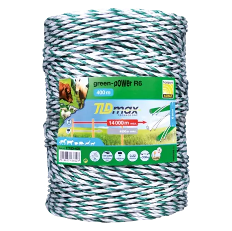 The Horizont Pasture Fence Rope – Green Power R6 (400 m) is a high-performance fencing rope designed for long fence lines and demanding conditions. Featuring TLDmax ladder conductors, this rope ensures excellent current flow and consistent electrical performance, making it ideal for reliable livestock containment.