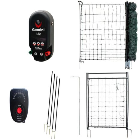 Powering the system is the Gemini energiser, which provides exceptional flexibility. It can operate from a 12V external battery or 230V mains supply using the included AC adaptor, making it suitable for both portable pens and more permanent setups. When powering from the mains, simply add a suitable length of HT lead-out cable to connect from your indoor power source to the fence.
