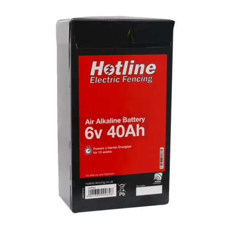 The Hotline 6V Air Alkaline Battery (40Ah) provides dependable, long-lasting power for the Hotline Harrier energiser (47HLB150). Designed for maximum performance, this internal air alkaline battery maintains a constant high voltage throughout its entire service life, ensuring consistent fence operation and optimal livestock safety — even with powerful energisers.