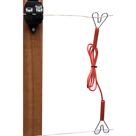 This line connector provides a simple link with good conductivity between 2 lines of wire, rope or polywire, with the clips fastening onto the lines in a similar manner to a pair of robust paper clips.
