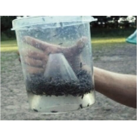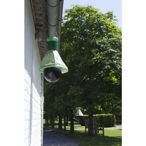 A horsefly trap takes the form of a black ball that is heated by the sun and releases heat. The ball swings slowly back and forth in the wind and is taken for an animal by the horsefly, which tries to sting it. However, horseflies are unable to pierce the ball with their stings. When their attempt fails, they fly upwards in search of another target, only to become trapped. Horseflies and wasps can only fly upwards, which means that they are caught in the trap container.
