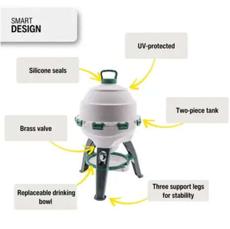 Built from durable, UV-resistant polypropylene, the drinker is designed for long-term outdoor use. Three sturdy feet provide stability on uneven ground, while the solid brass stopcock valve offers a reliable alternative to traditional rubber ball systems. The included silicone hoses allow the water level to be adjusted to suit your setup, making the drinker both flexible and easy to use.