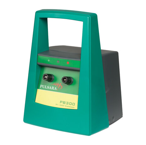 Pulsara PB300 is a 9 Volt battery energiser, ideal for professional and hobby use. The robust design makes the energiser low maintenance and protects the battery against all elements. If you need an energiser for 3 km of fencing, the PB300 is your solution.