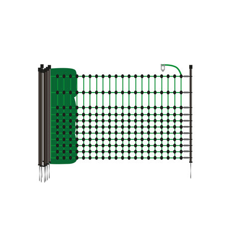 This net has dark green strand, which makes it blend in very well with the natural surroundings. Of the 10 horizontal plastic strands, 9 are live stainless steel conductors, the currentless ground strand is hard-wearing and durable thanks to additional plastic threads.